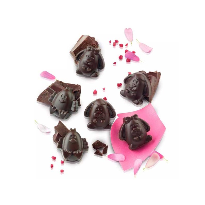 Forma em silicone que permite fazer 12 pintaìnhos e coelhos de chocolate, perfeitos para decorar os seus doces de Páscoa.