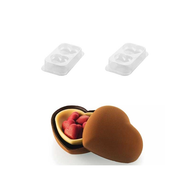 Kit de 2 moldes termoformados reutilizáveis para fazer corações 3D em chocolate.Pequeno: 93 x 99 cm x 36 mm Grande: 123 x 115 cm x 44 mm Volume: 120 ml