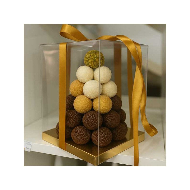 Caixa em pvc com tamanho: 18 x 18 x 20cm com base dourada alta para bolos,brigadeiros ou outros doces.