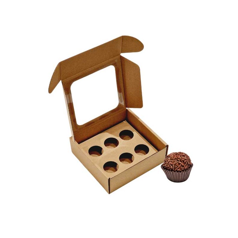 Caixa em cartão Kraft com 14x14x5cm, divisoria para 6 brigadeiros.