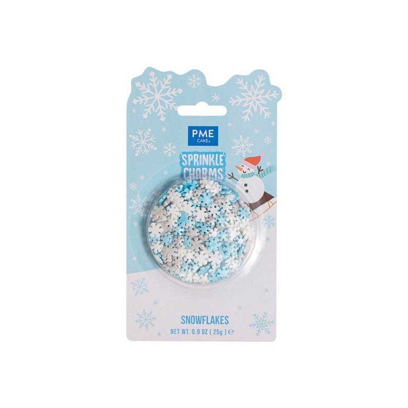 25g de granulado de Natal em forma de flocos de neve azuis, prateados e brancos.