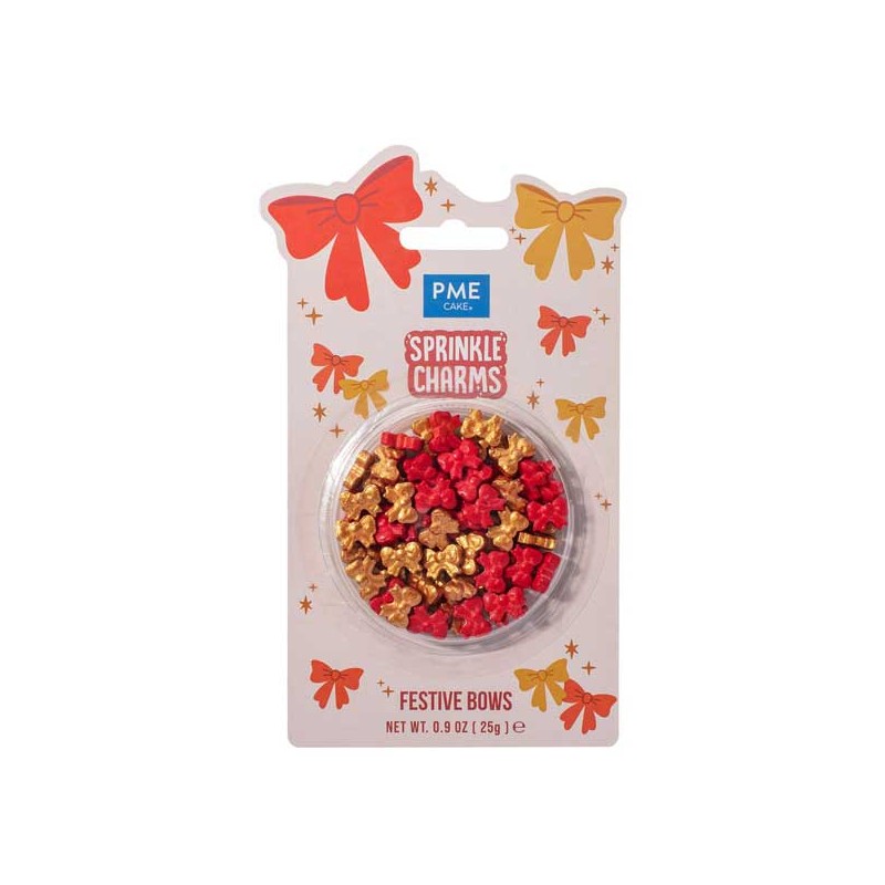 25g de granulado de Natal em forma de laços vermelhos e dourados.