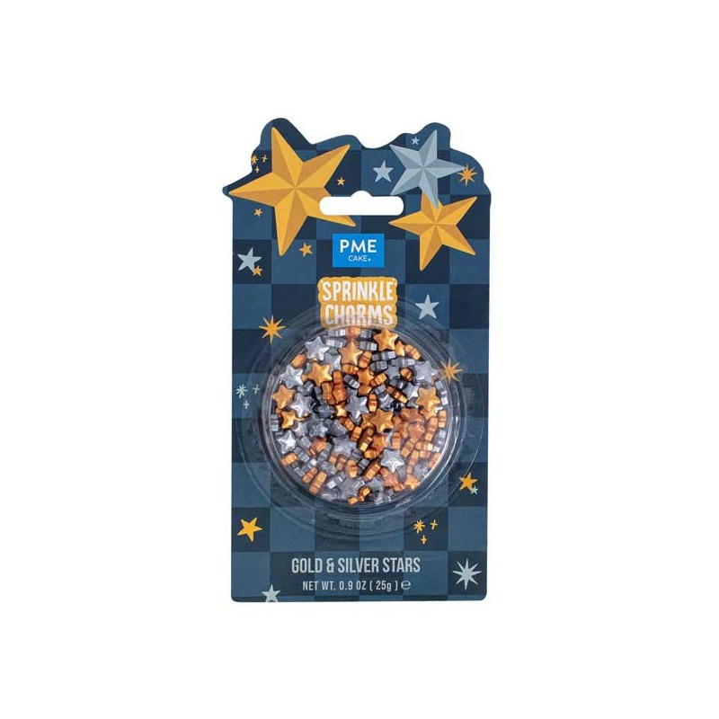 25g de granulado de Natal em forma de estrelas douradas e prateadas