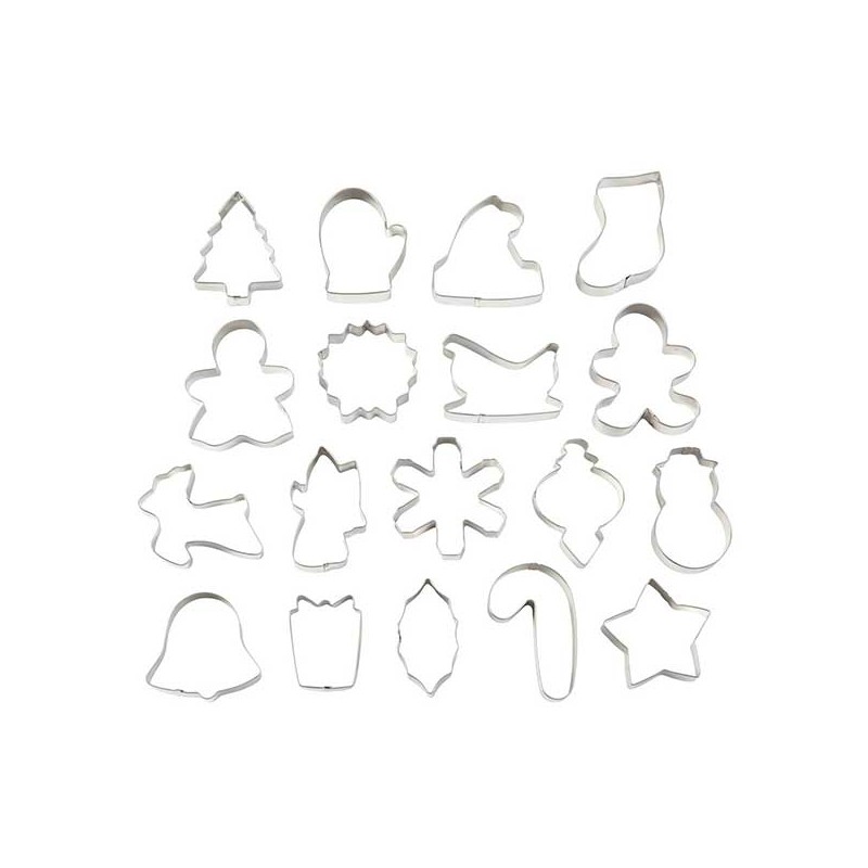 Inclui: floco de neve, folha de azevinho, 2 boncecos de gengibre, estrela, trenó, árvore, meia, boneco de neve, rena, enfeite, chupa-chupa, chapéu de Pai Natal, anjo, sino, presente, grinalda e luva.