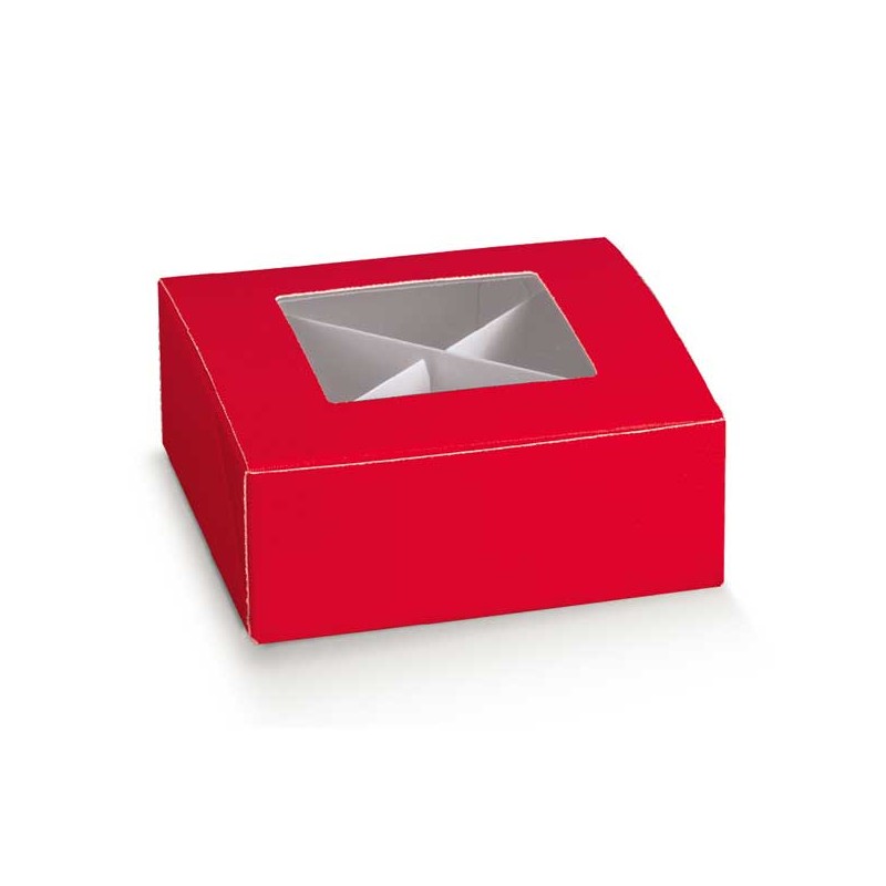 Caixa vermelha de Pastelaria 10 x 10 x 4cm com visor pvc para doces.