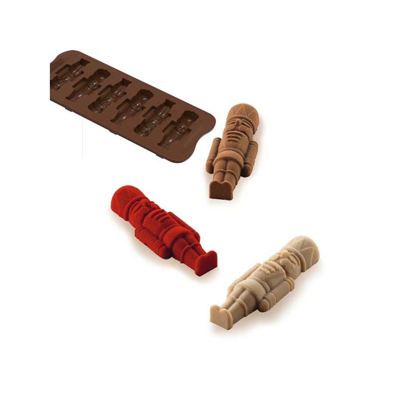 Molde em silicone platina ideal para criar chocolates no formato clássico do soldadinho quebra-nozes. Muito fácil de usar: derreta o chocolate, verta no molde e obtenha chocolates perfeitos e brilhantes. Também pode ser usado com gelo. Dimensões: 26×84×14 mm. Volume: 13,5ml.