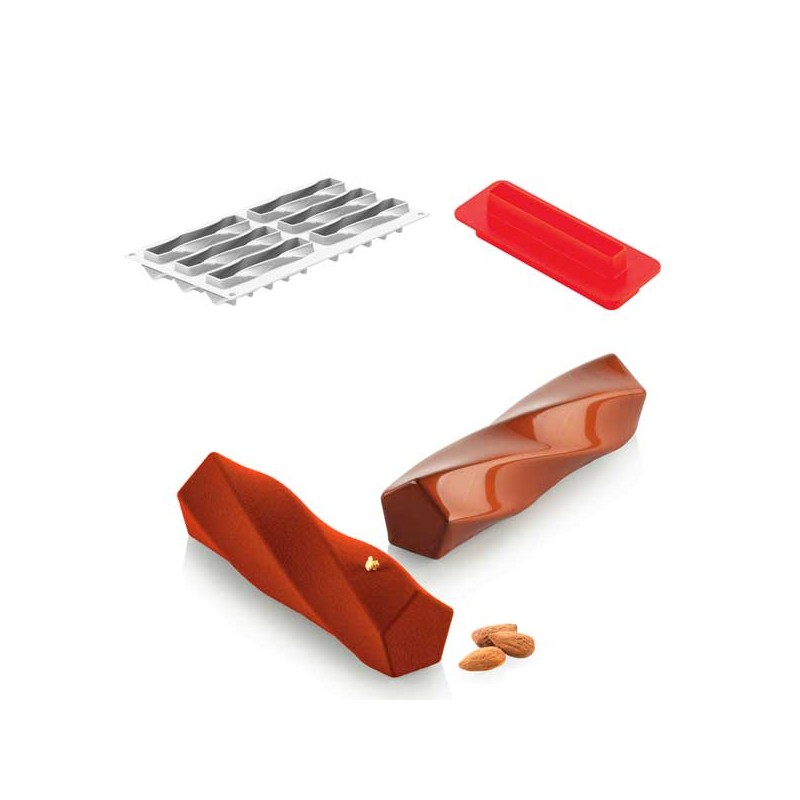 Forma de silicone projetada para criar sobremesas individuais com um design exclusivo. Vem com um cortador, permitindo criar tanto recheios quanto bases para a sobremesa. Possui seis cavidades, cada uma com capacidade de 90 ml. Tamanho: 130 x 33 x 30 mm