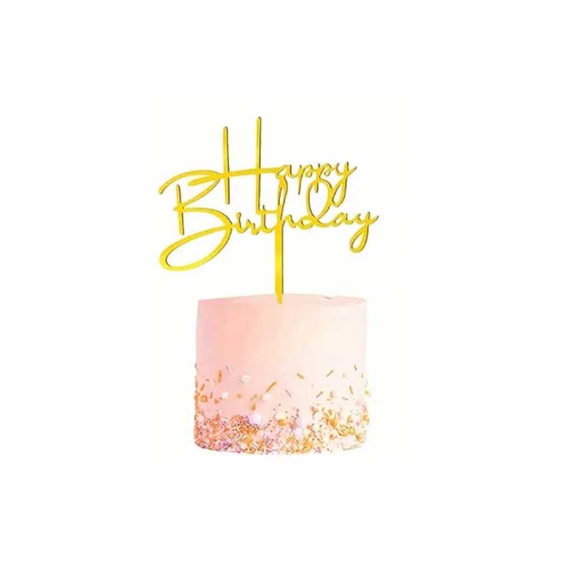 Topo de Bolo Acrilico Happy Birthday Dourado com 10,5x12,3cm