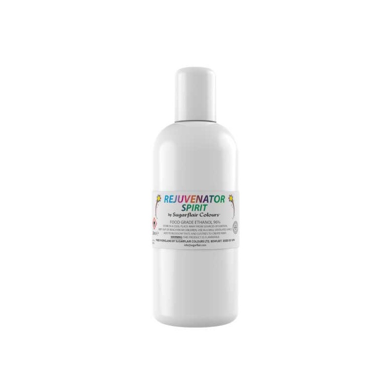 Sugarflair Rejuvenator Spirit é um tipo de álcool adequado para uso em produtos alimentares. Usado para criar tinta com corante em pó e pintar os seus bolos.