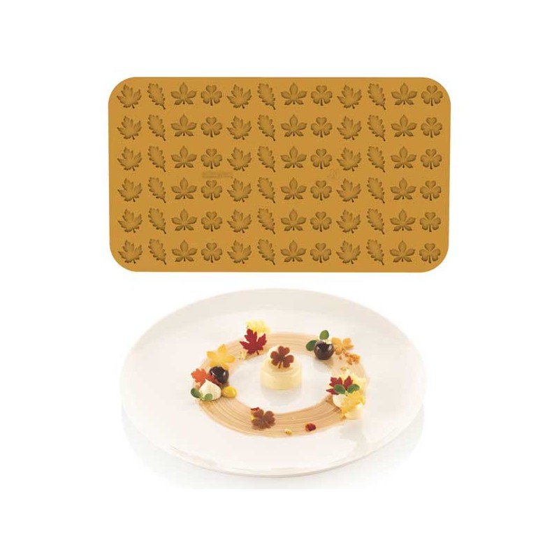 O tapete de silicone com cavidades em formato de folha permite criar decorações finas e refinadas tanto em massa cigarette quanto em chocolate, perfeito para decorar sobremesas.