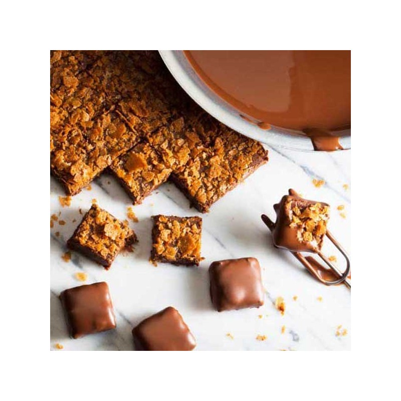 está pronta para adicionar aos seus pralinés e gianduja. Ideal tambem para misturar com chocolate temperado para adicionar um interior crocante aos bombons, pastelarias e sobremesas. Pailleté Feuilletine permanecerá crocante.