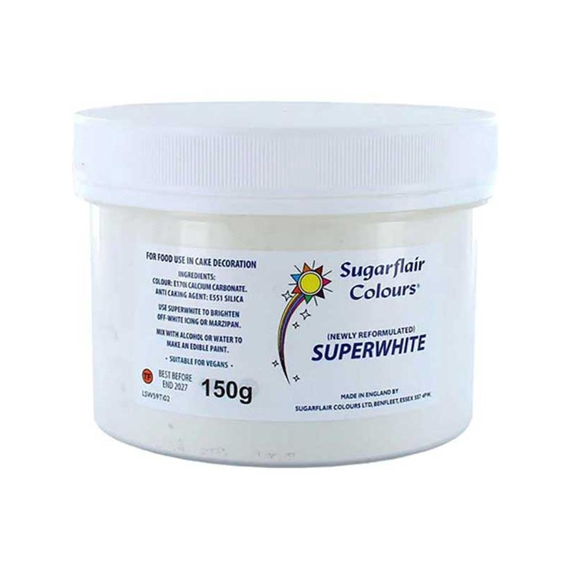 O Sugarflair Superwhite é um corante em pó desenvolvido para realçar a cor de glacês ou chocolate branco, ajudam a branquear a pasta de açúcar e a reduzir a tonalidade amarelada nos cremes de manteiga e nos chocolates.
