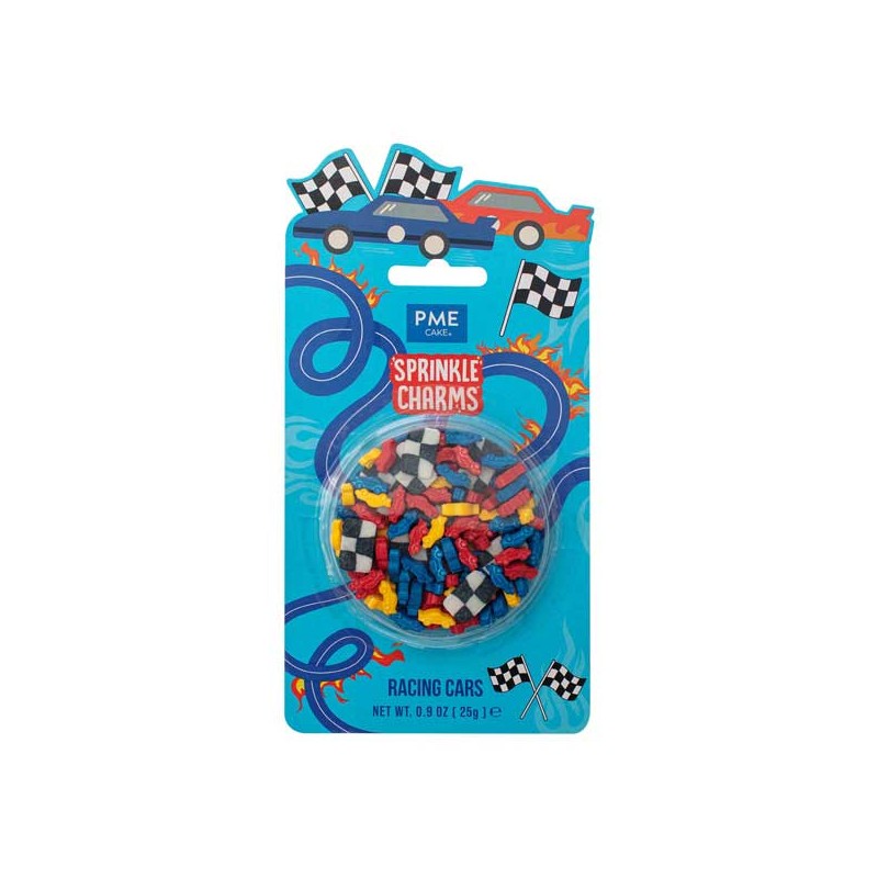 Adicione personalidade e diversão instantaneamente às suas criações com estes sprinkles Carros de Corrida e Bandeira de Xadrez