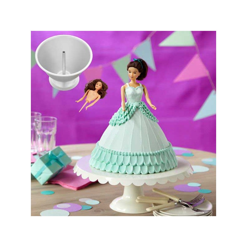 Com esta forma de bolo poderá criar uma saia elegante 3D, depois é só colocar a boneca incluida neste kit.