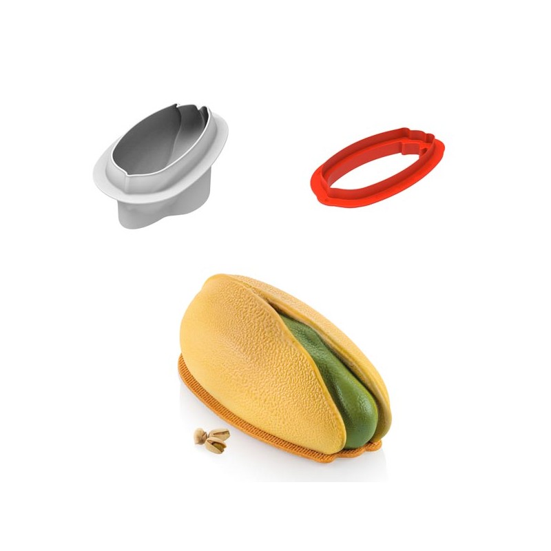 Pistacchio 750 da silikomart é um kit que inclui um molde para fazer bolos ou semifrios em forma de pistache, e um cortador de plástico Abs para criar bases ou insertos.