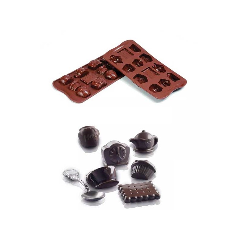 Forma silicone com 6 formas diferentes para fazer bombons de chocolate com o tema hora do chá.